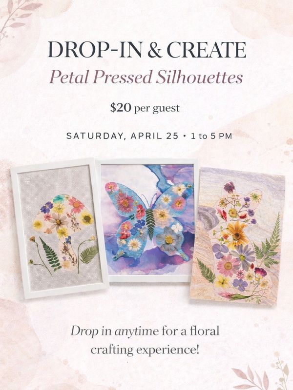 At this special Drop-In & Create event, guests are invited to slow down and explore the delicate art of pressed flowers. Choose from a collection of thoughtfully designed silhouettes—mushrooms, butterflies, animals, and more—and bring them to life using real pressed florals.